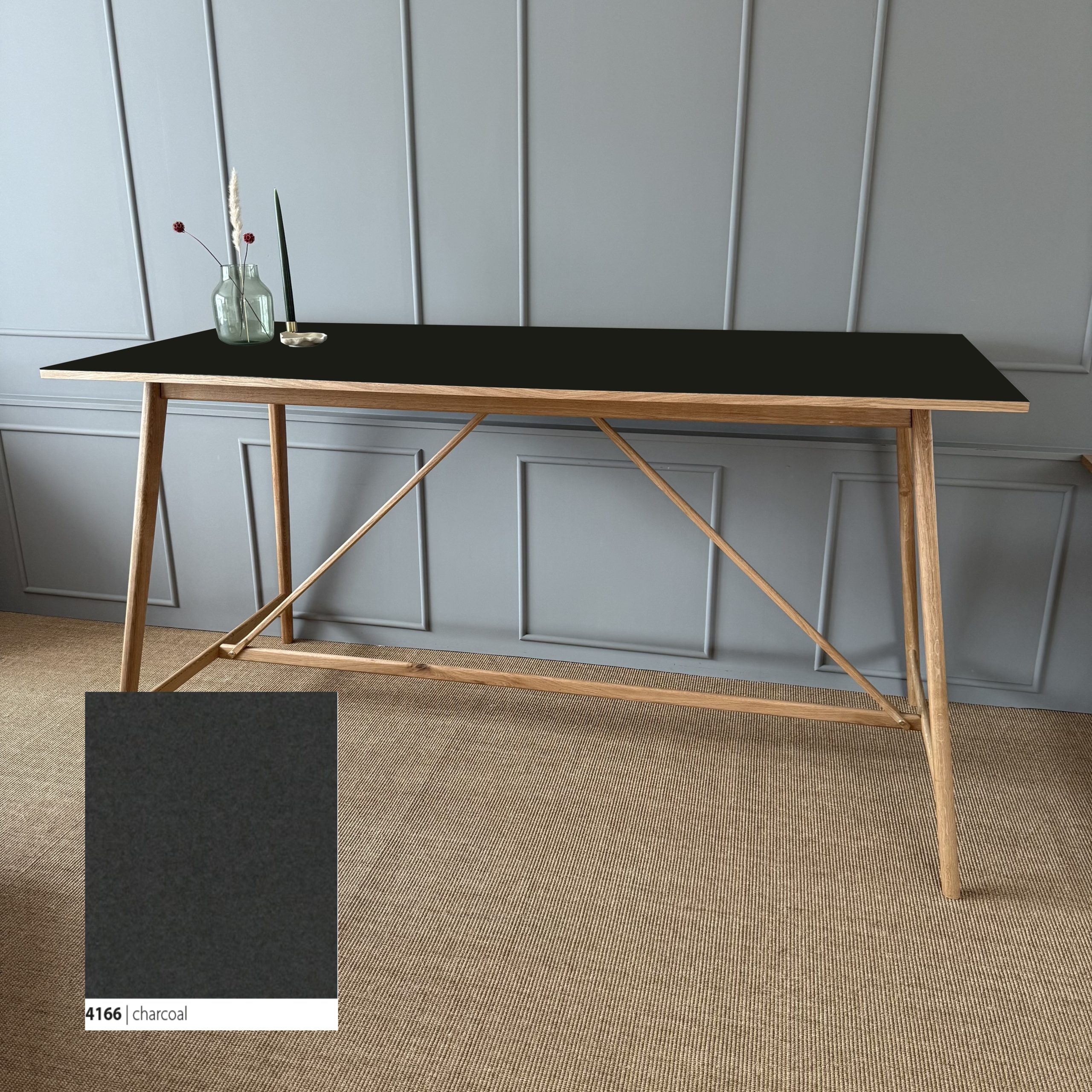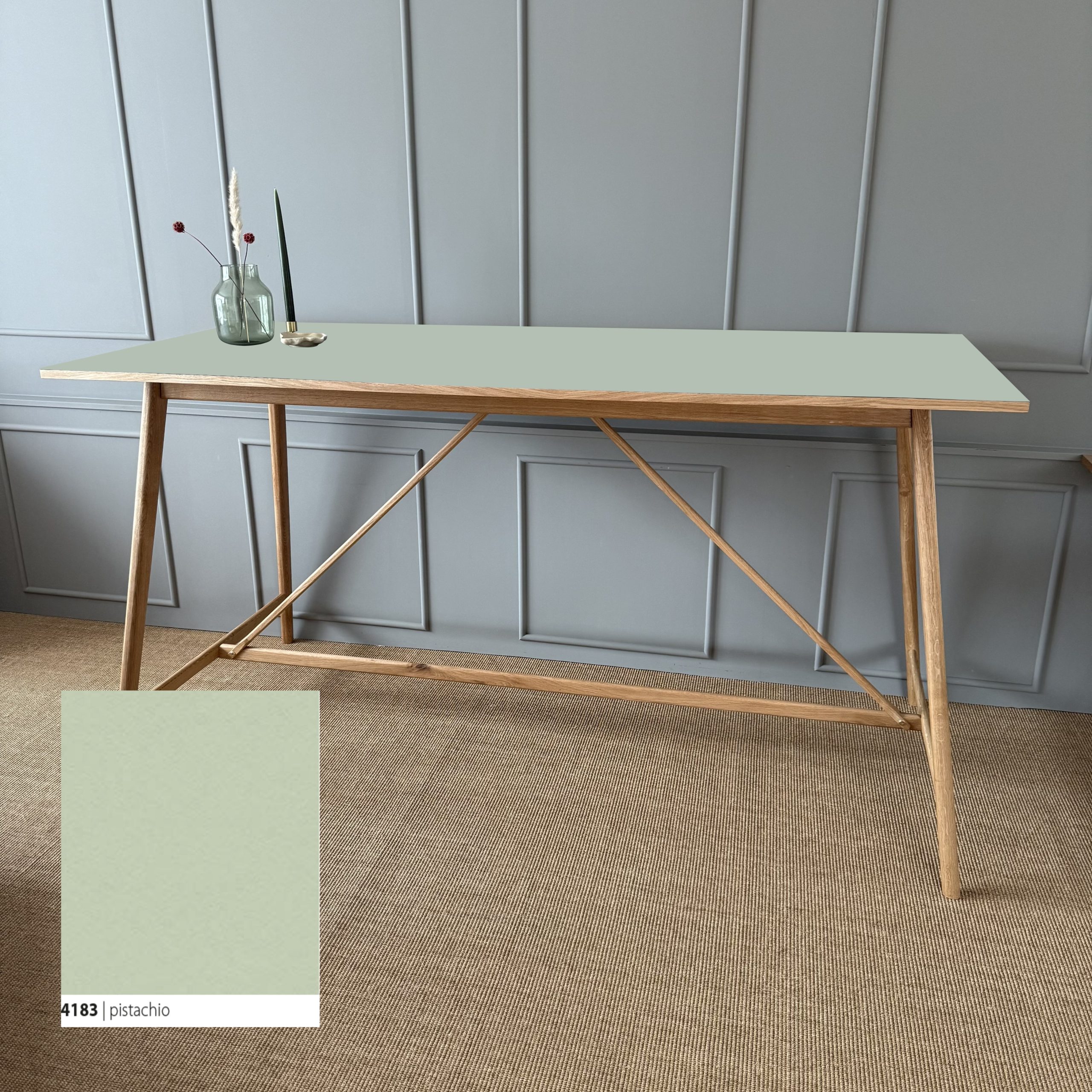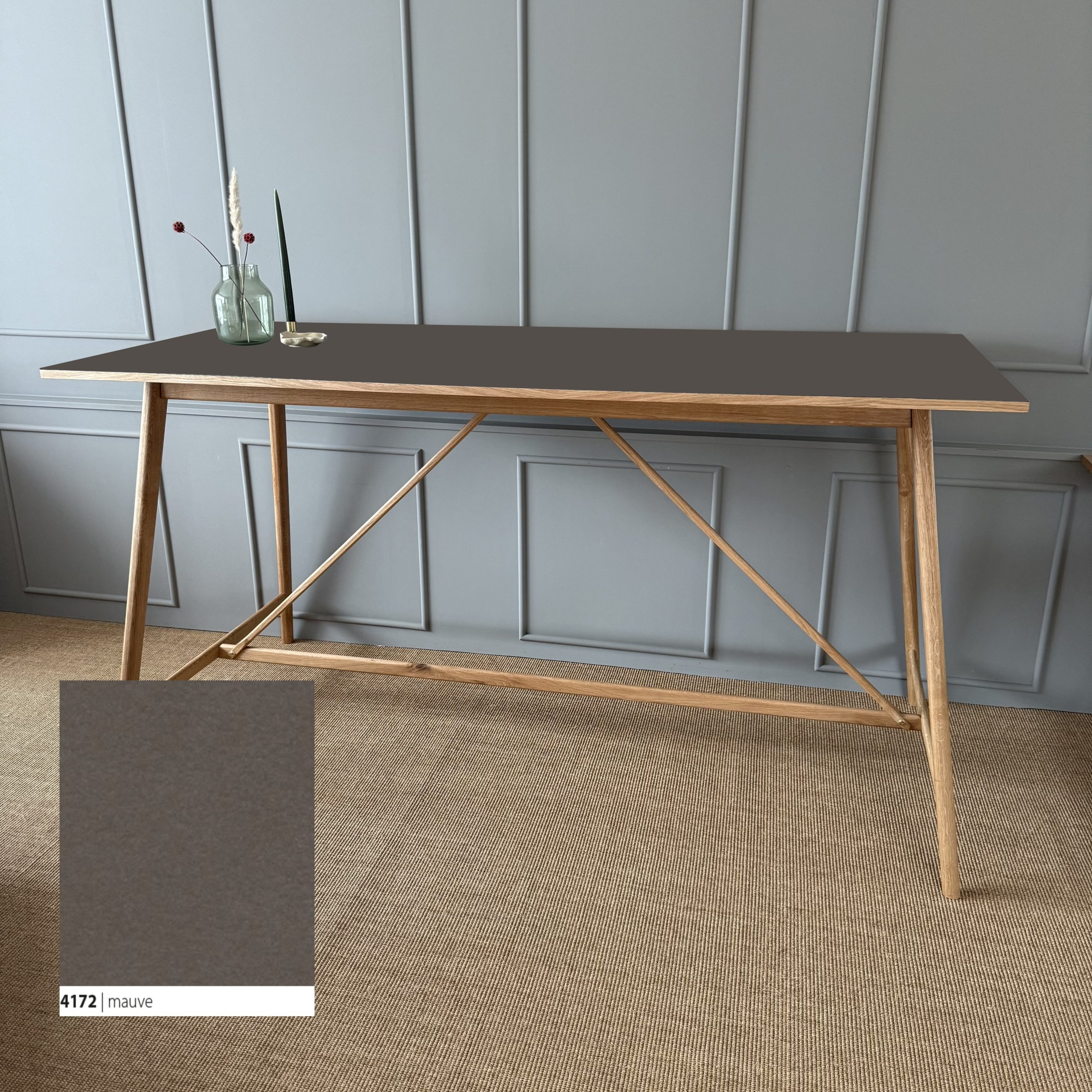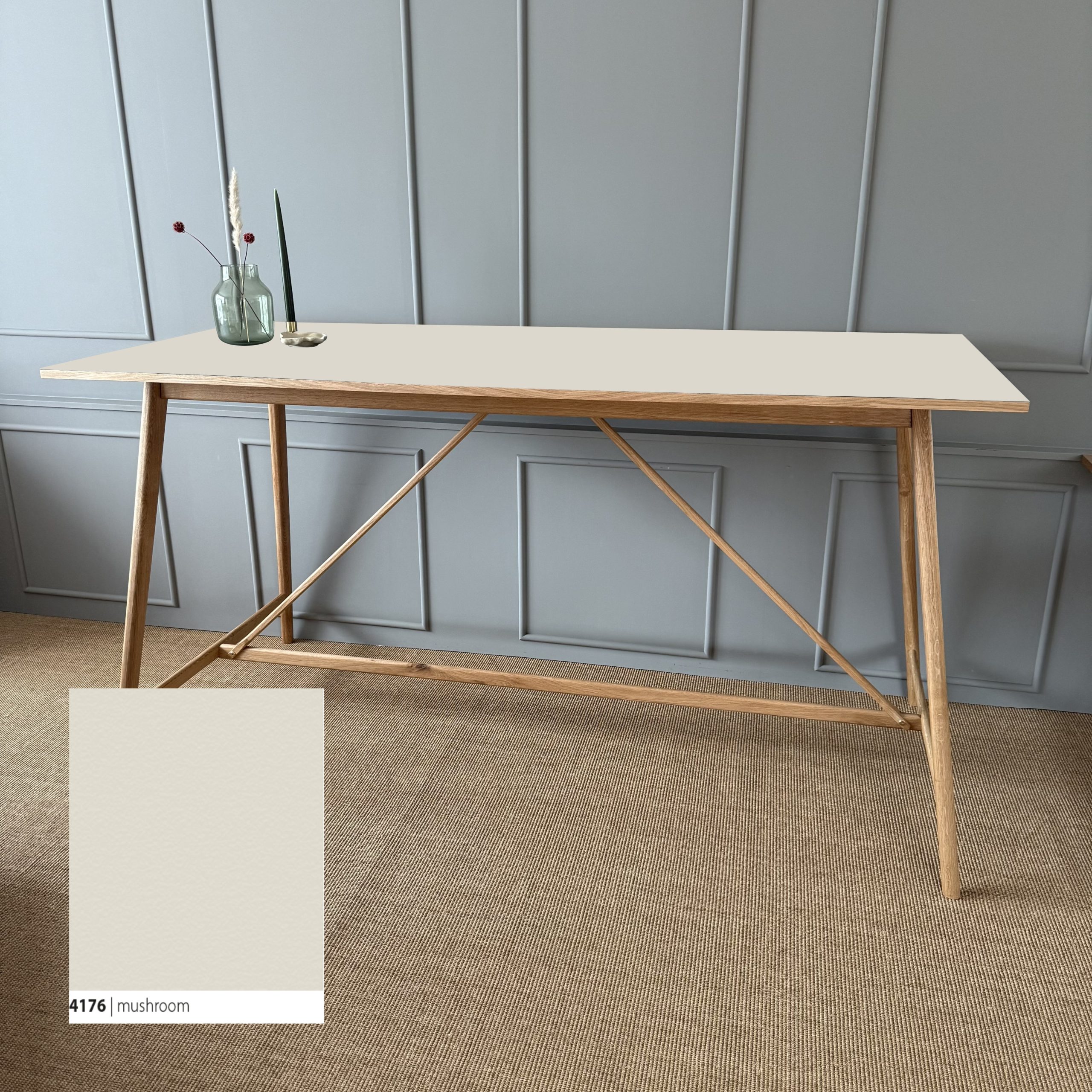 Et smukt og klassisk bord med et moderne udtryk, der tager afsæt i kombinationen af den bløde linoleumsbordplade, som både er funktionel og vedligeholdelsesvenlig, og et håndlavet smukt stel til at bære bordet.