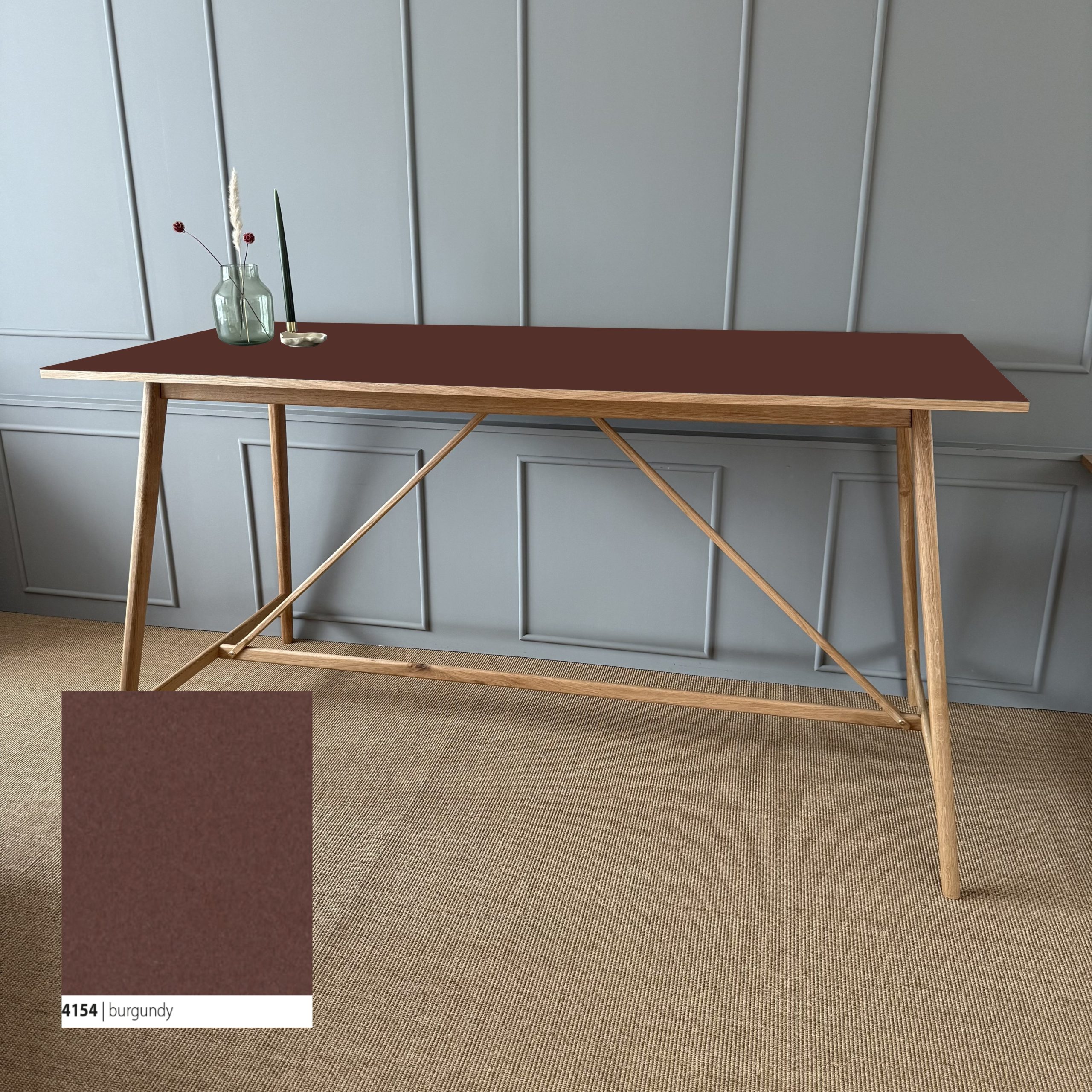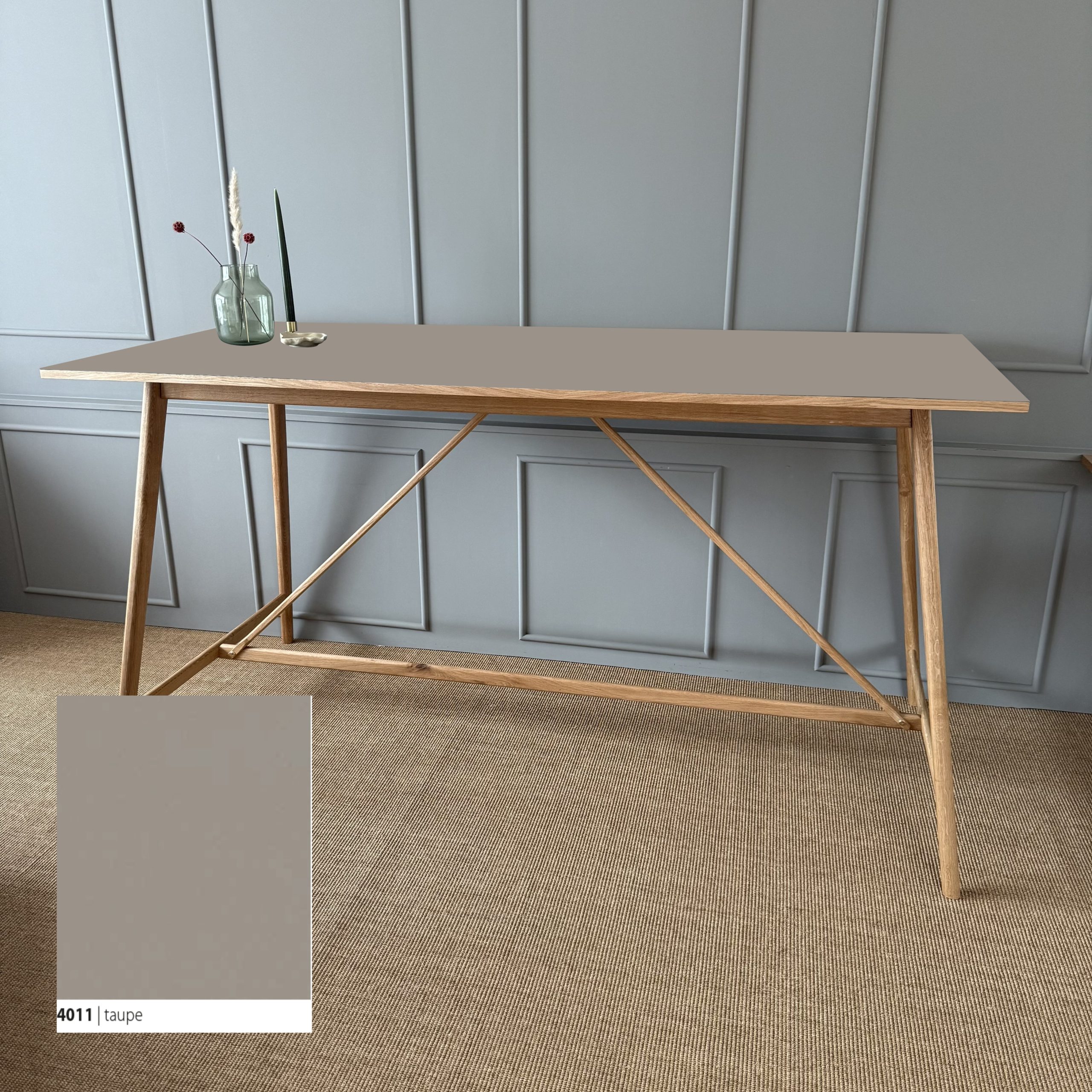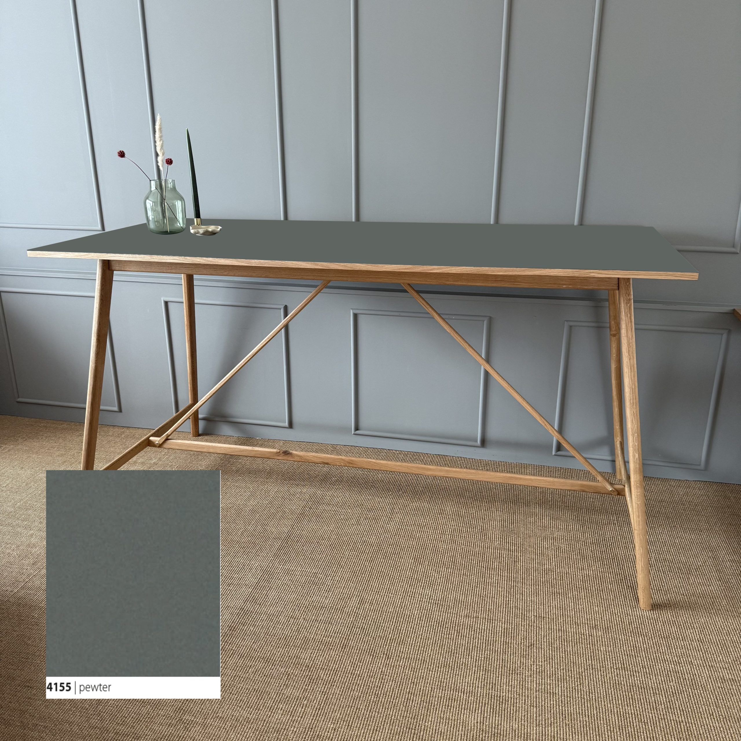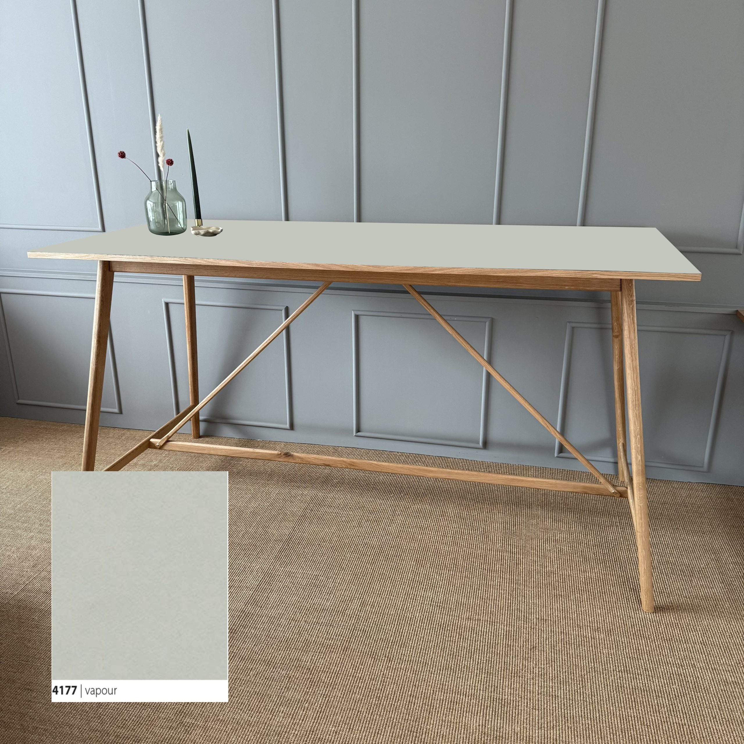 Et smukt og klassisk bord med et moderne udtryk, der tager afsæt i kombinationen af den bløde linoleumsbordplade, som både er funktionel og vedligeholdelsesvenlig, og et håndlavet smukt stel til at bære bordet.