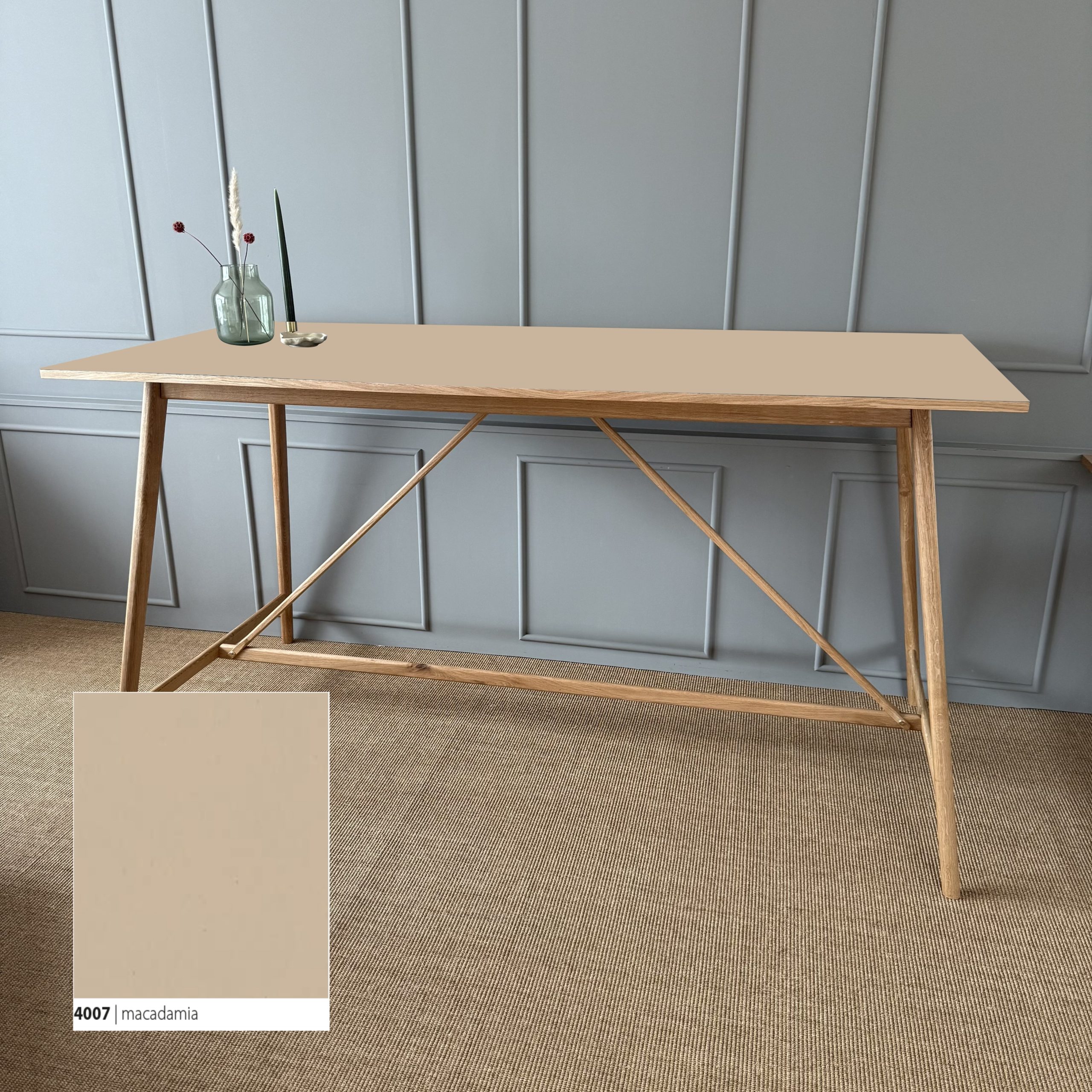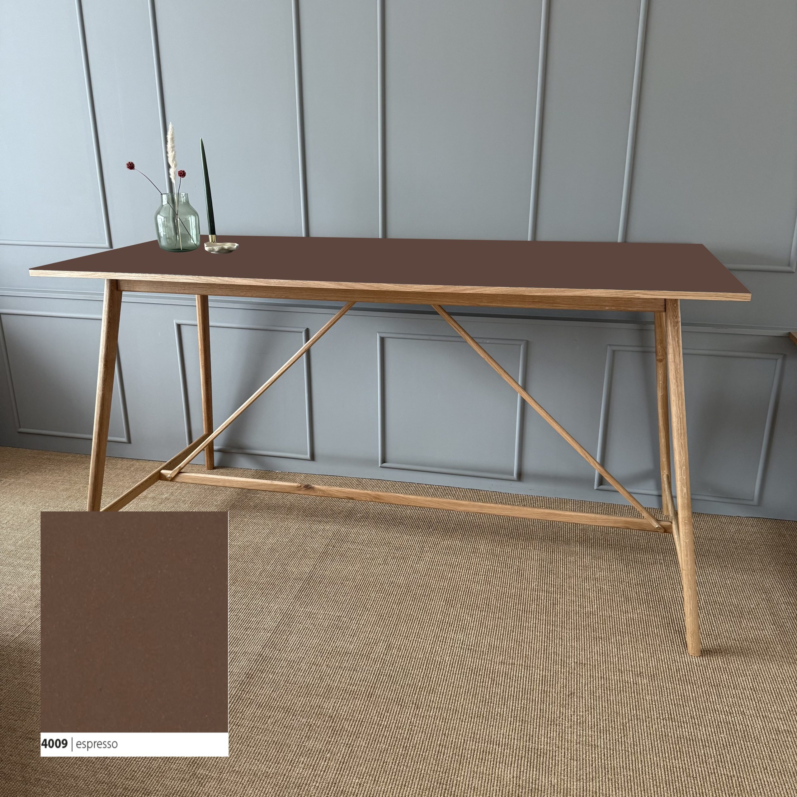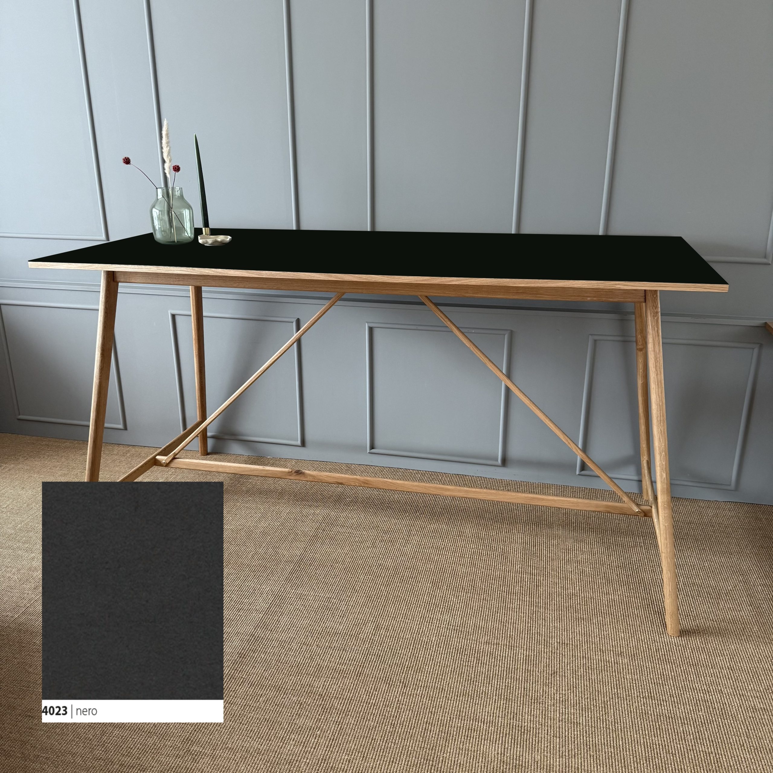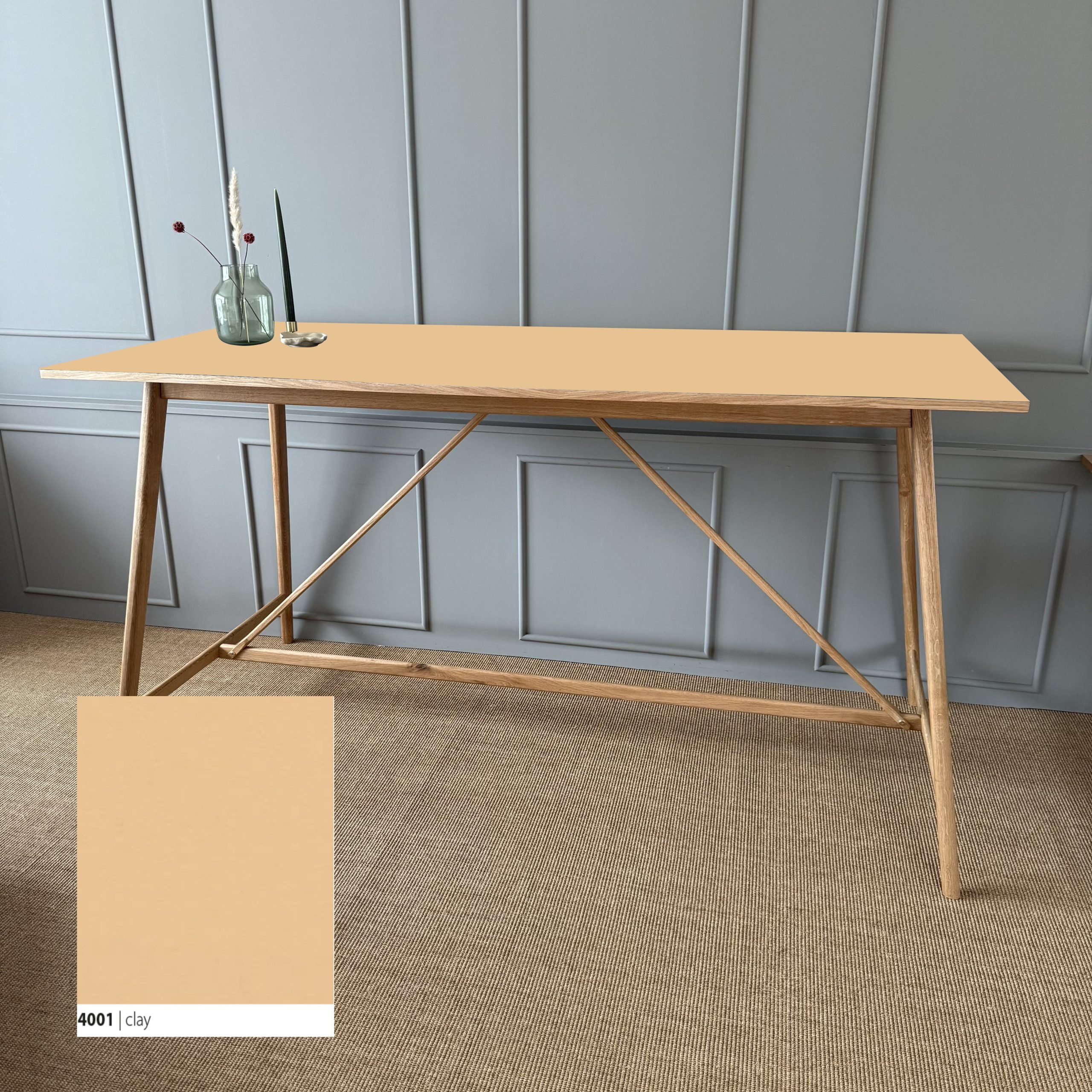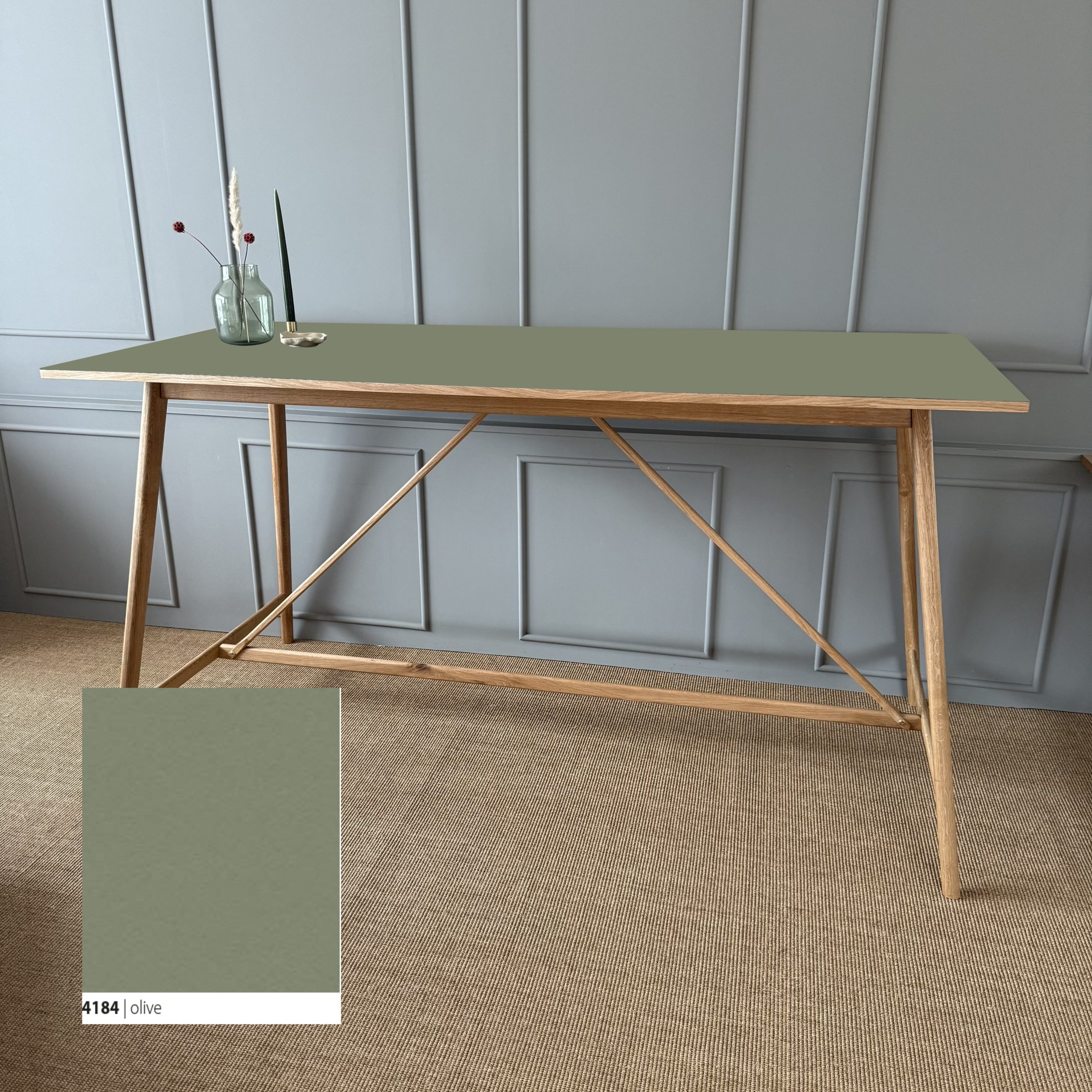 Et smukt og klassisk bord med et moderne udtryk, der tager afsæt i kombinationen af den bløde linoleumsbordplade, som både er funktionel og vedligeholdelsesvenlig, og et håndlavet smukt stel til at bære bordet.