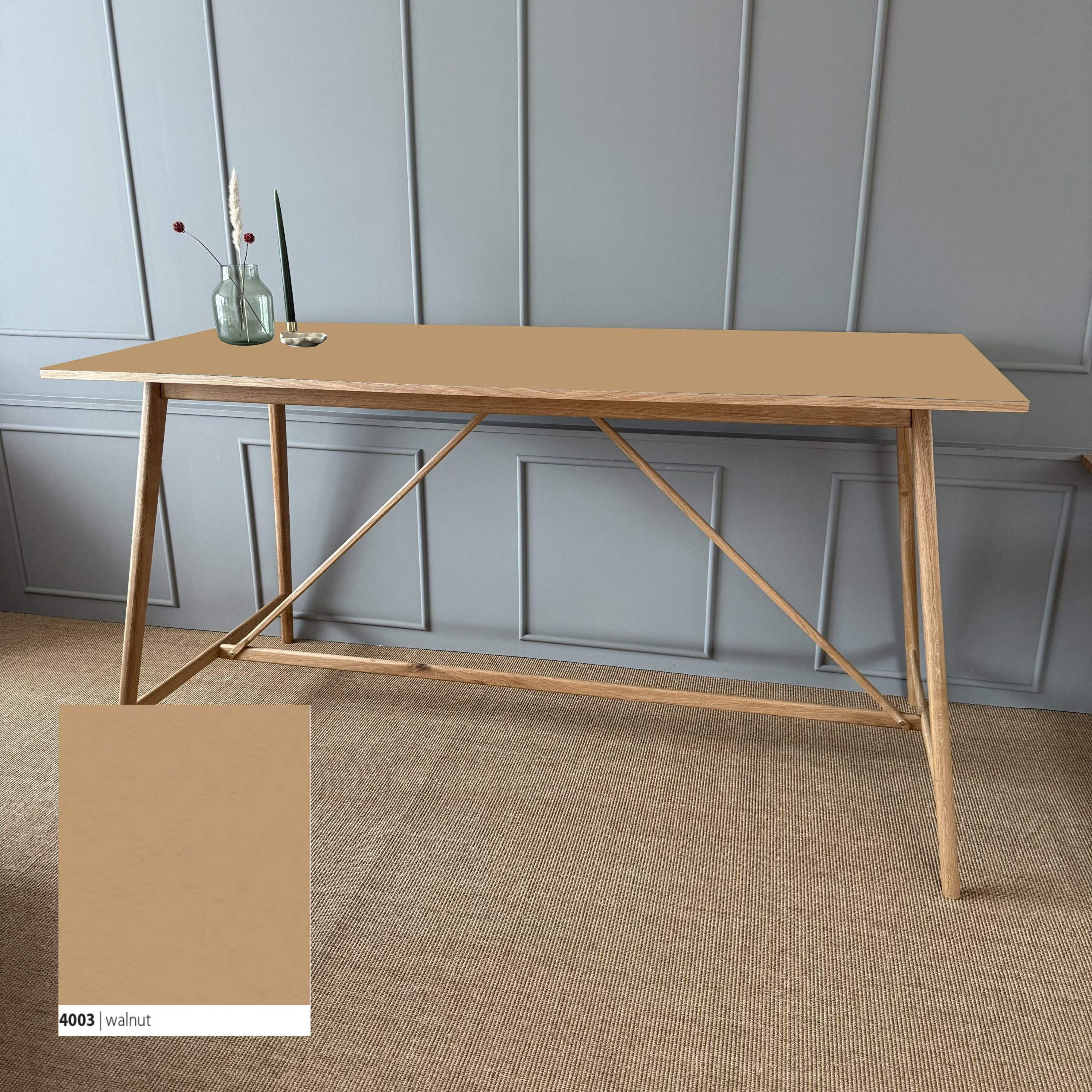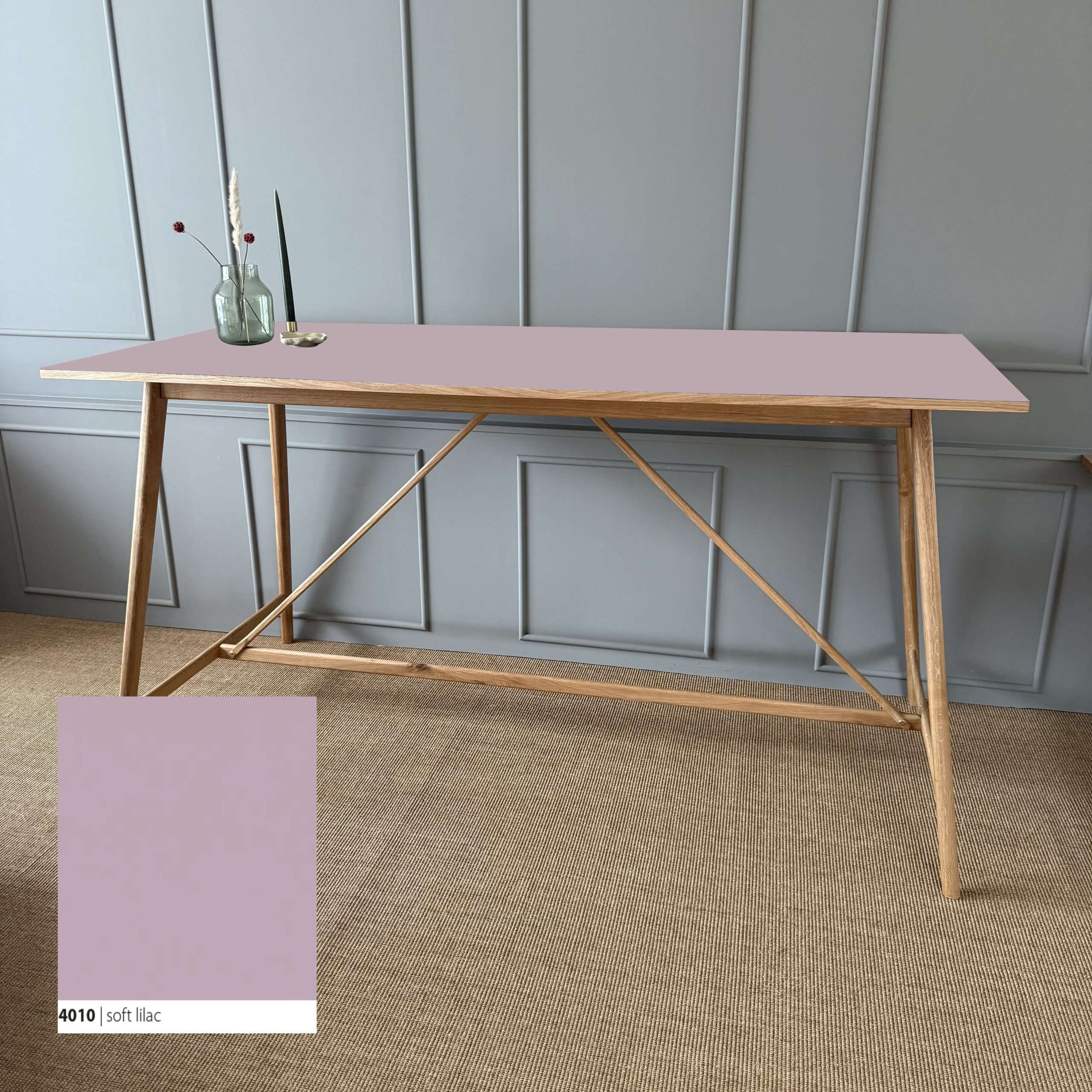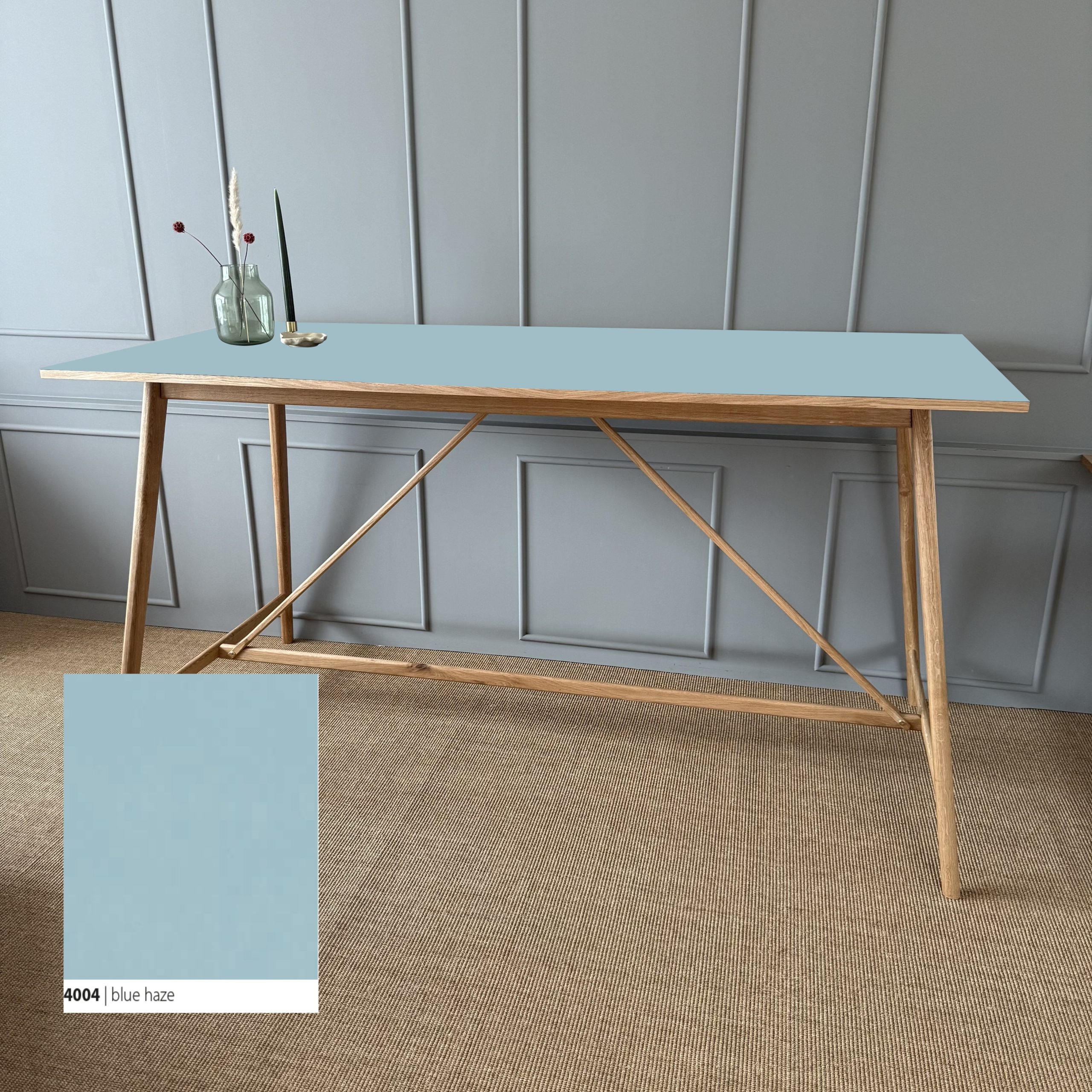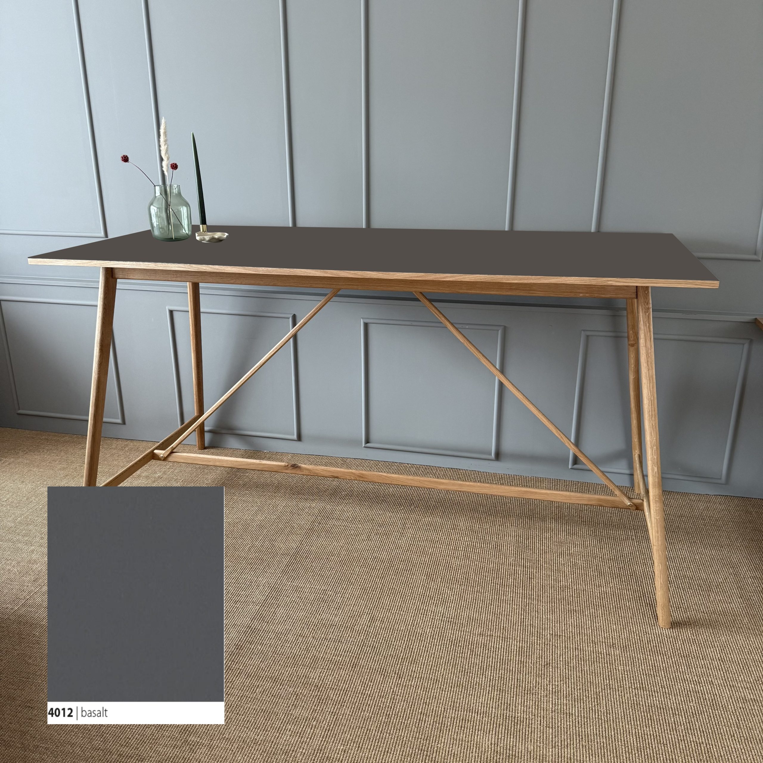 Et smukt og klassisk bord med et moderne udtryk, der tager afsæt i kombinationen af den bløde linoleumsbordplade, som både er funktionel og vedligeholdelsesvenlig, og et håndlavet smukt stel til at bære bordet.