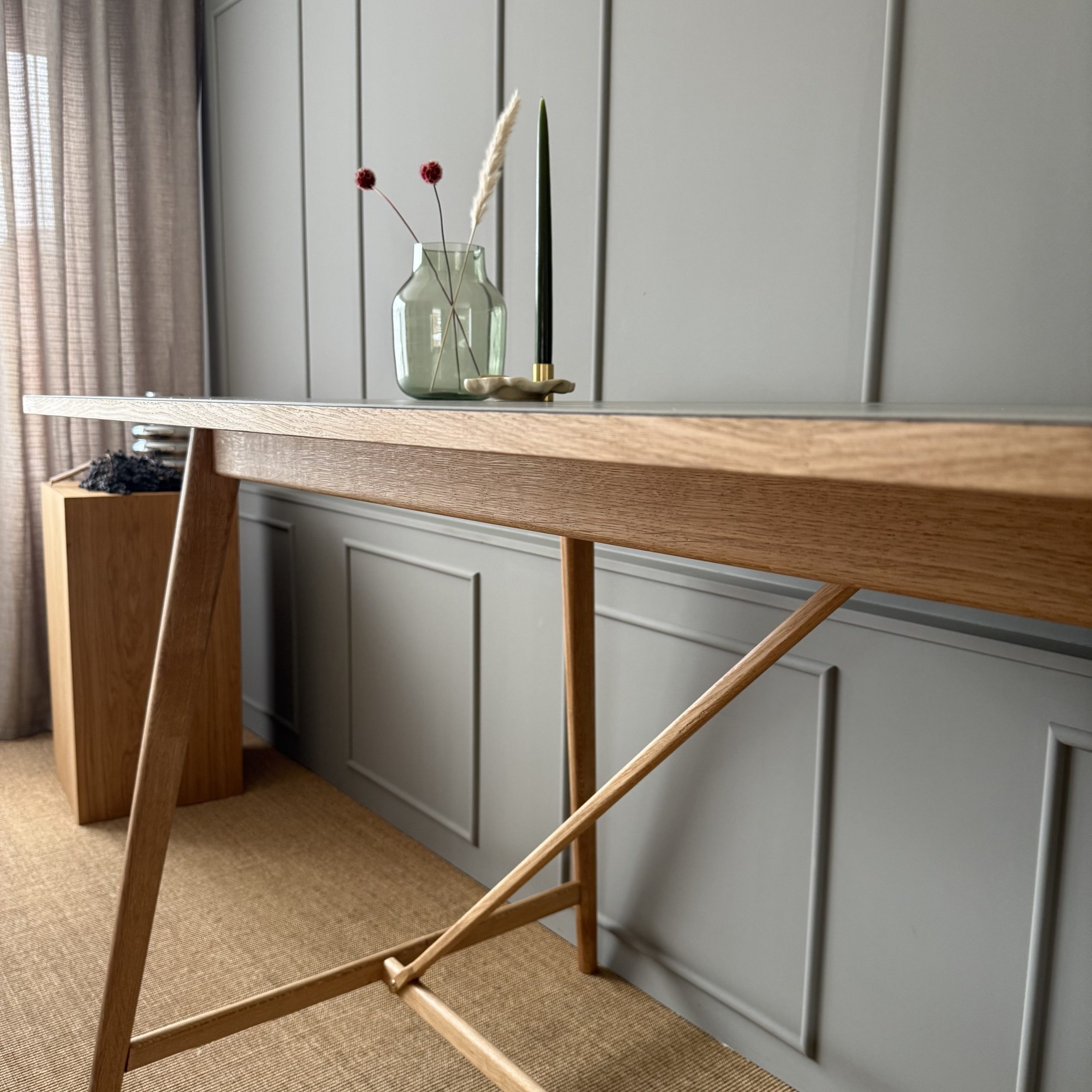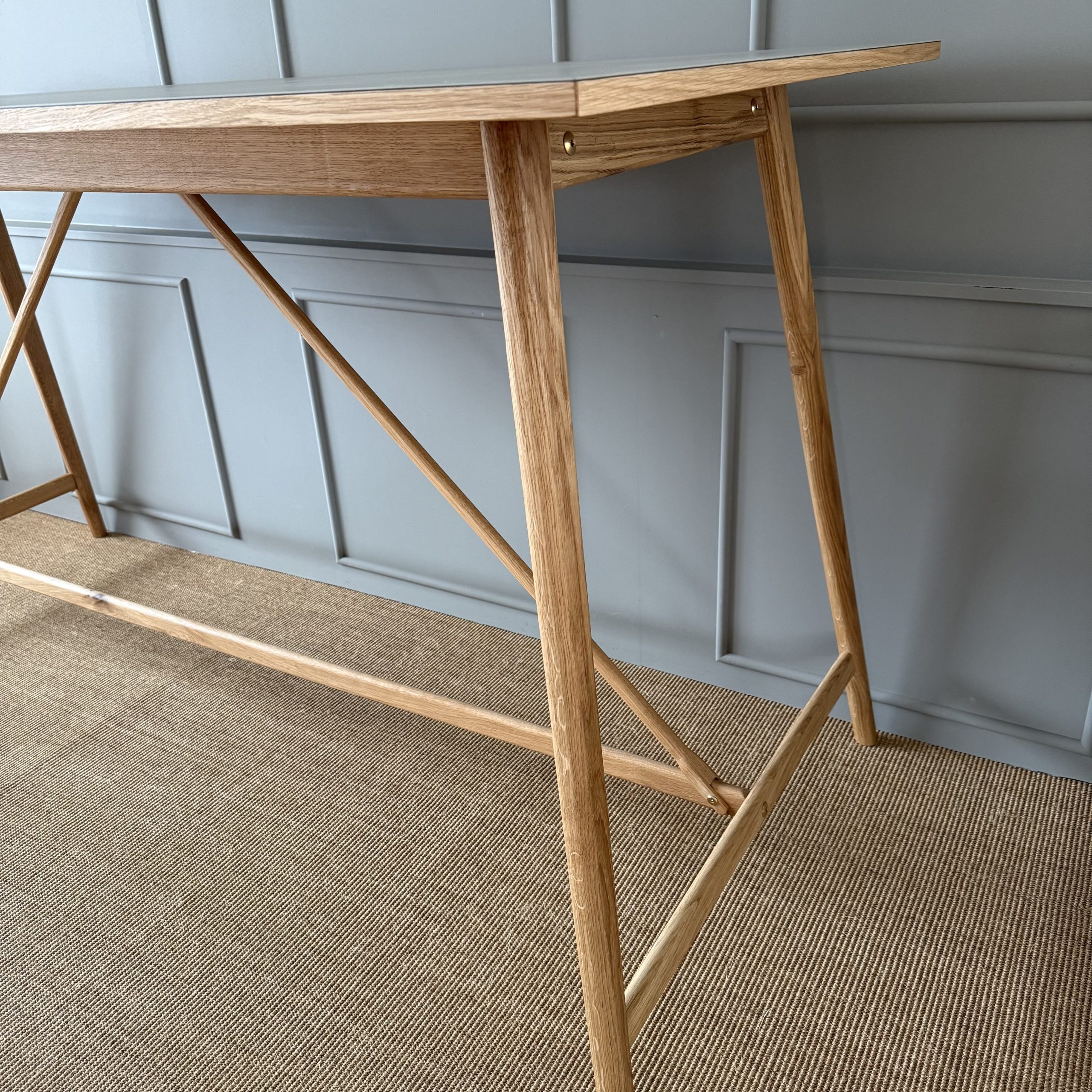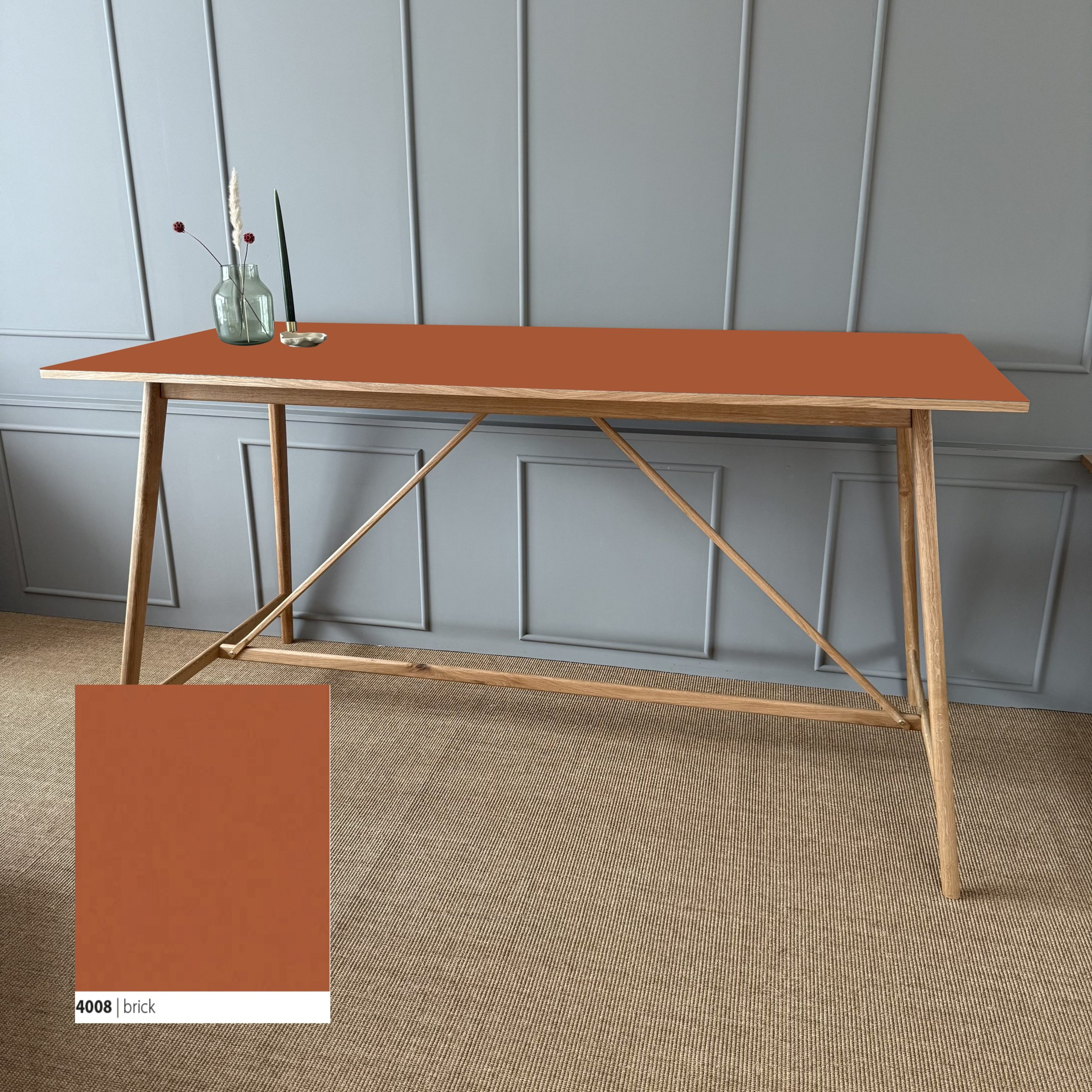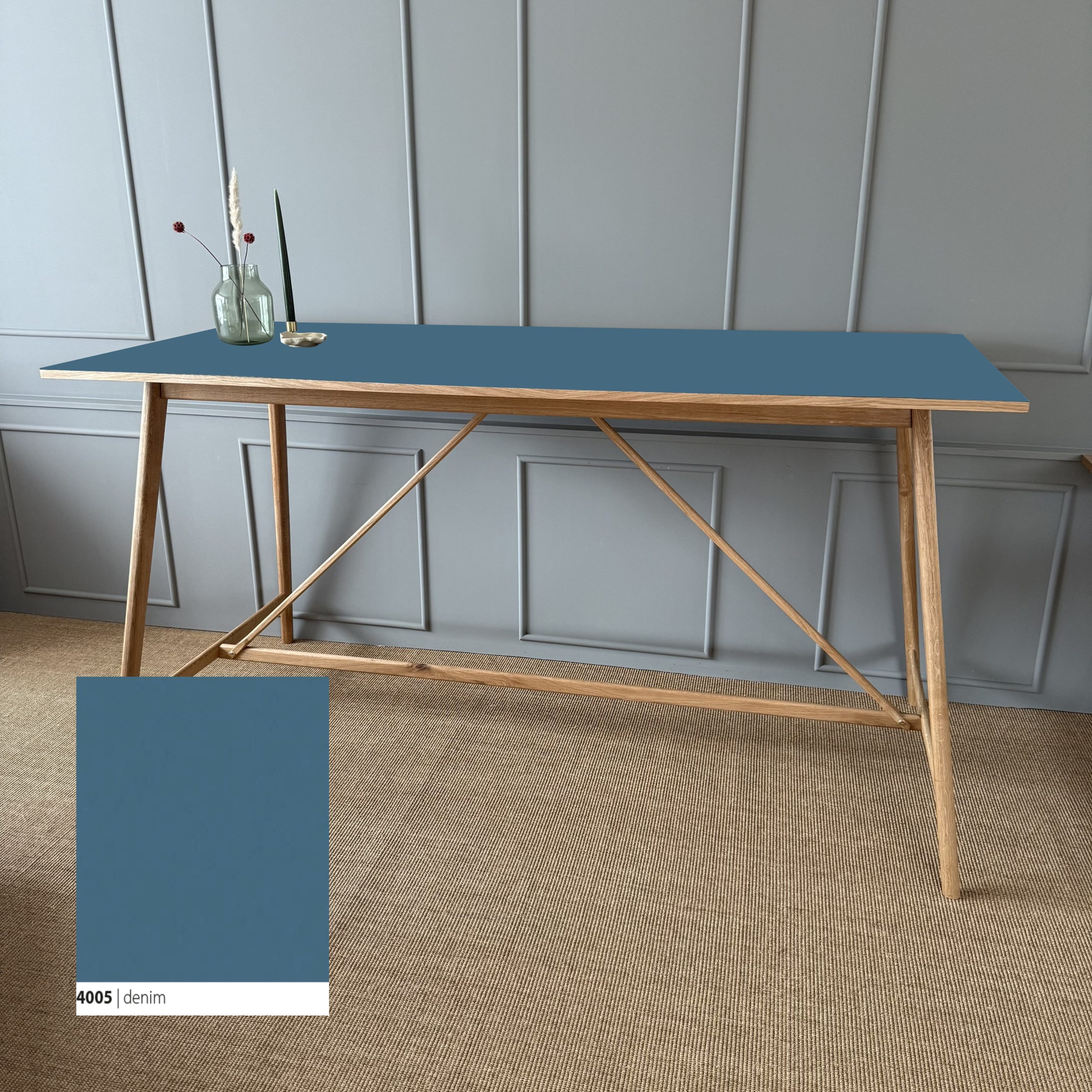 Et smukt og klassisk bord med et moderne udtryk, der tager afsæt i kombinationen af den bløde linoleumsbordplade, som både er funktionel og vedligeholdelsesvenlig, og et håndlavet smukt stel til at bære bordet.