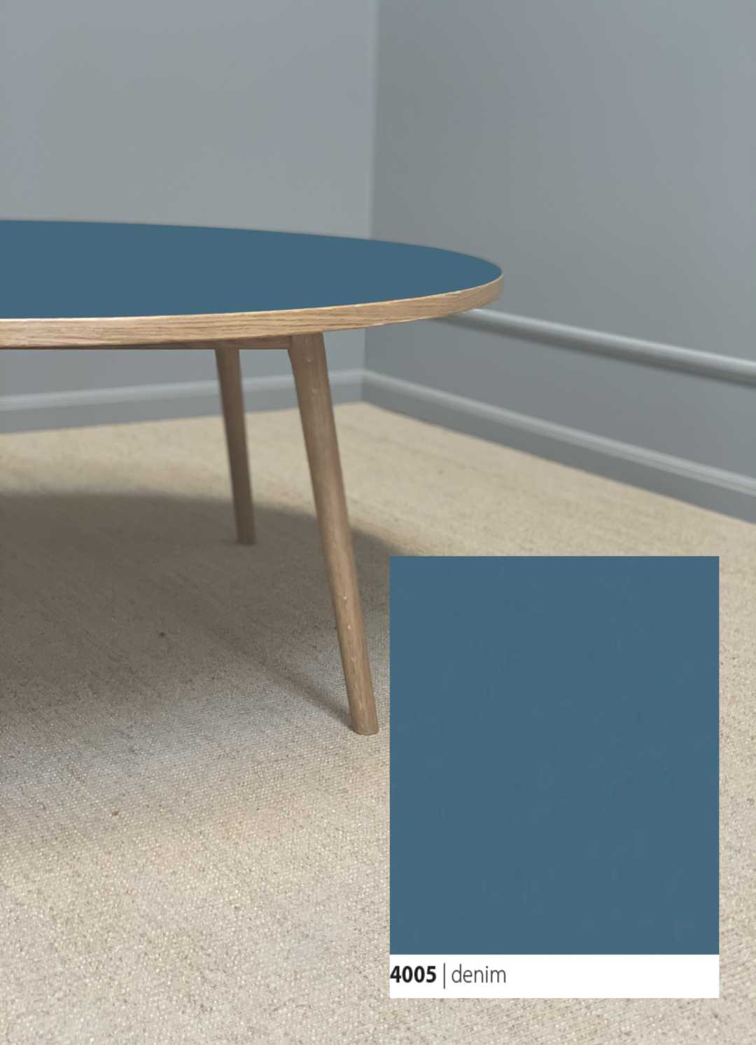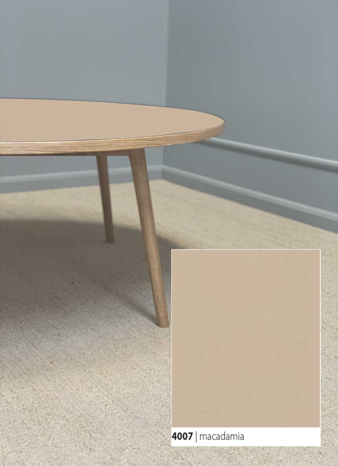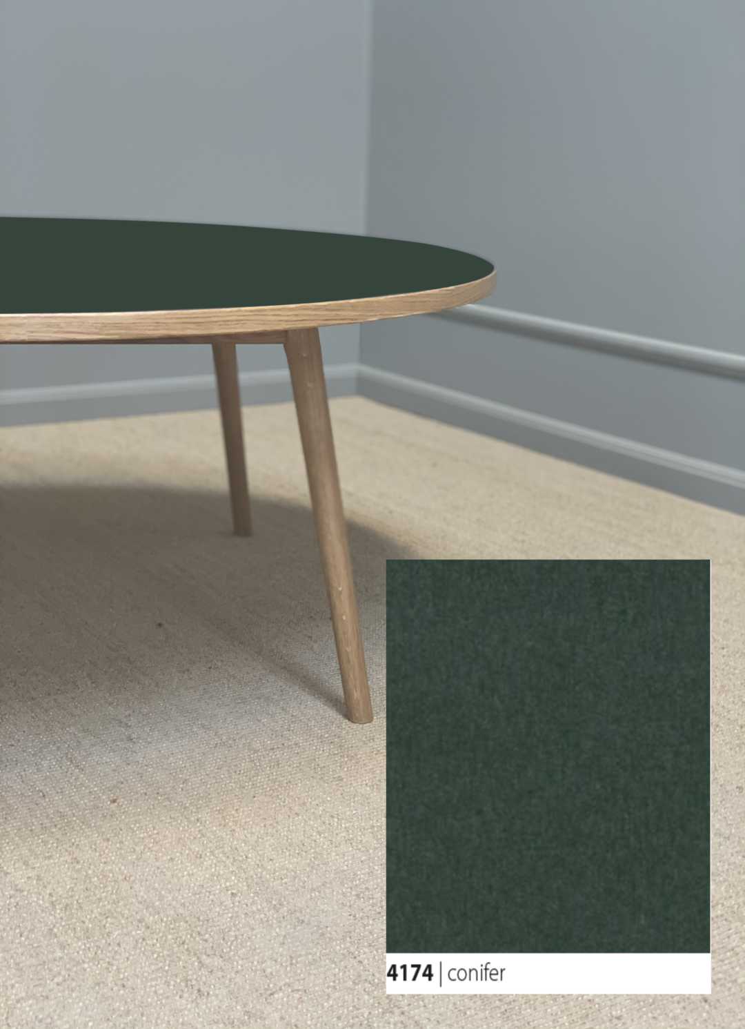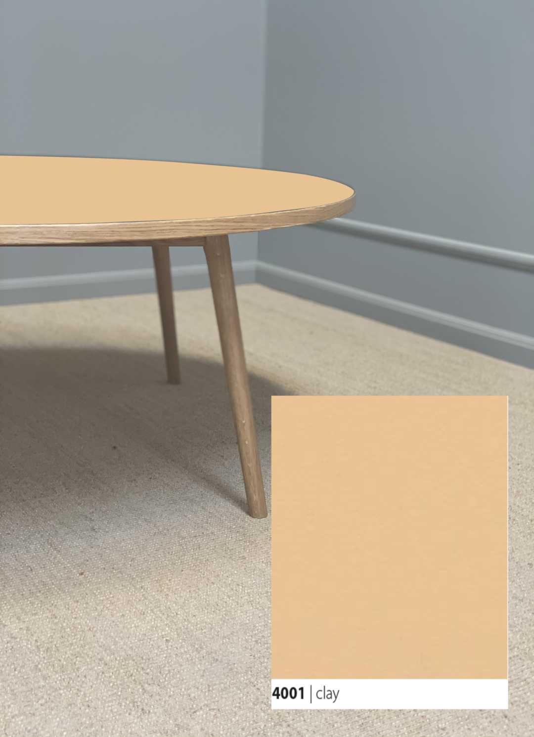 Et smukt og klassisk sofa med et moderne udtryk, der tager afsæt i kombinationen af den bløde linoleumsbordplade, som både er funktionel og vedligeholdelsesvenlig, og et håndlavet smukt stel til at bære bordet.