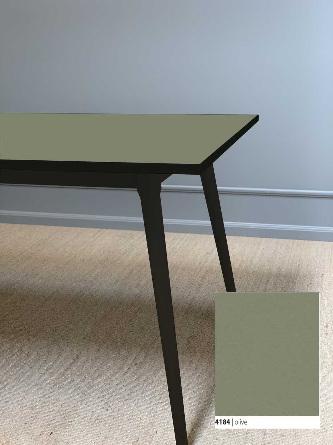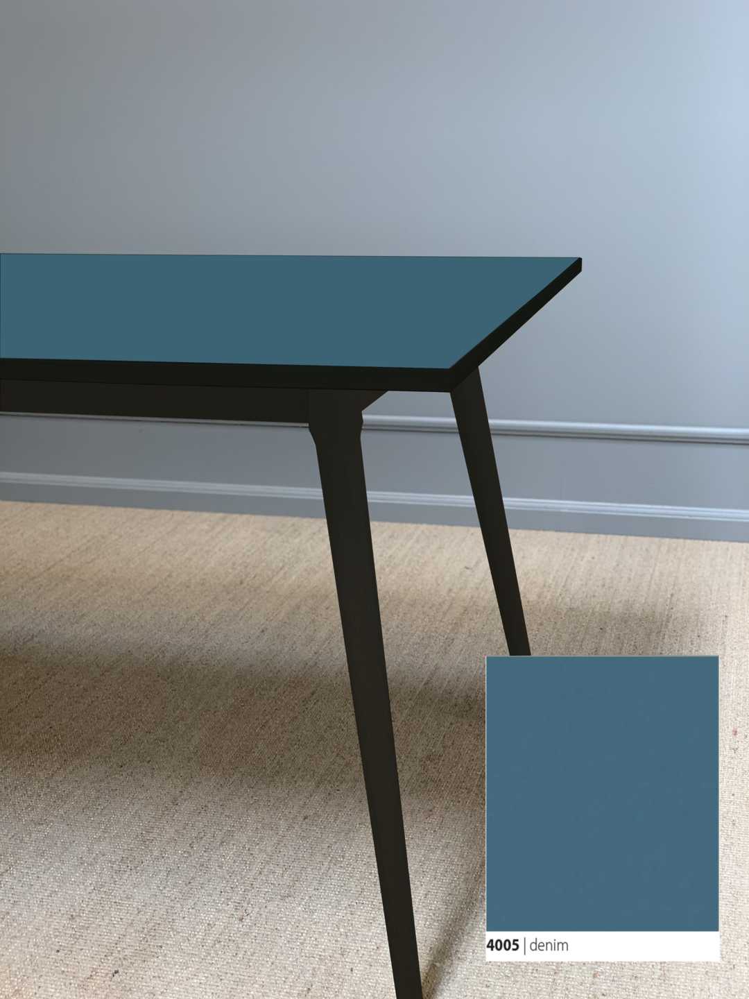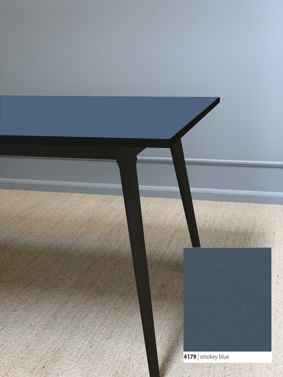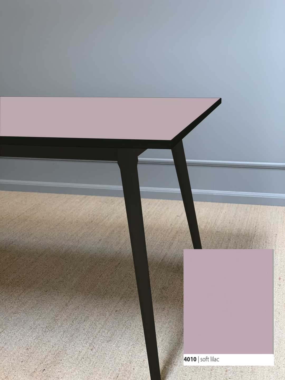 Et smukt og klassisk spisebord med et moderne udtryk, der tager afsæt i kombinationen af den bløde linoleumsbordplade, som både er funktionel og vedligeholdelsesvenlig, og et håndlavet smukt stel til at bære bordet.
