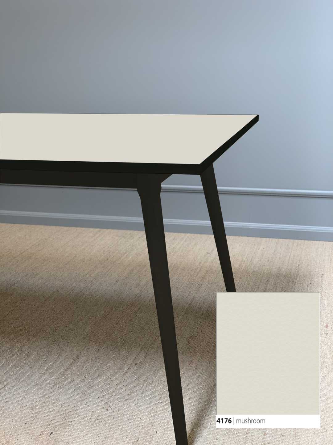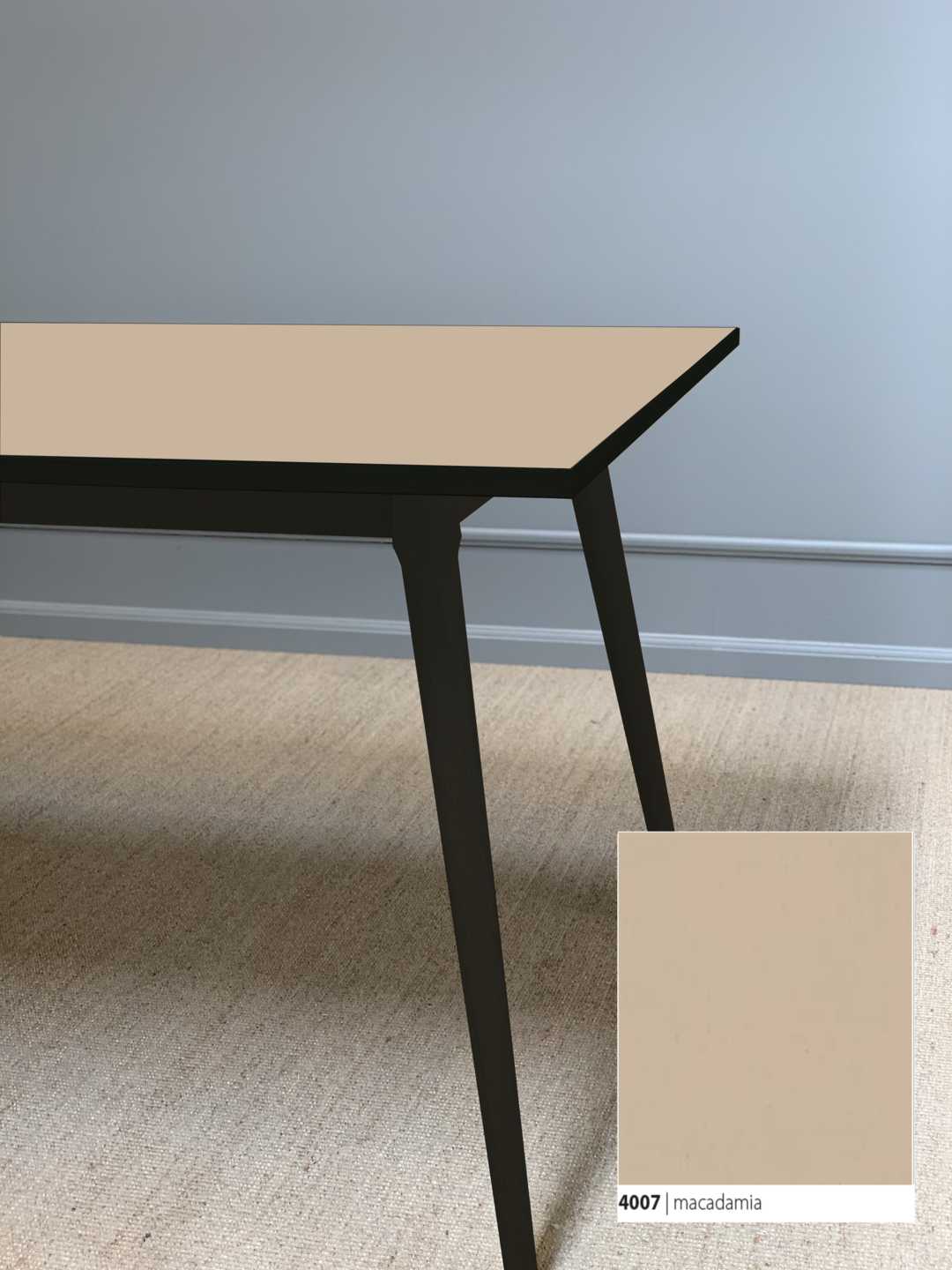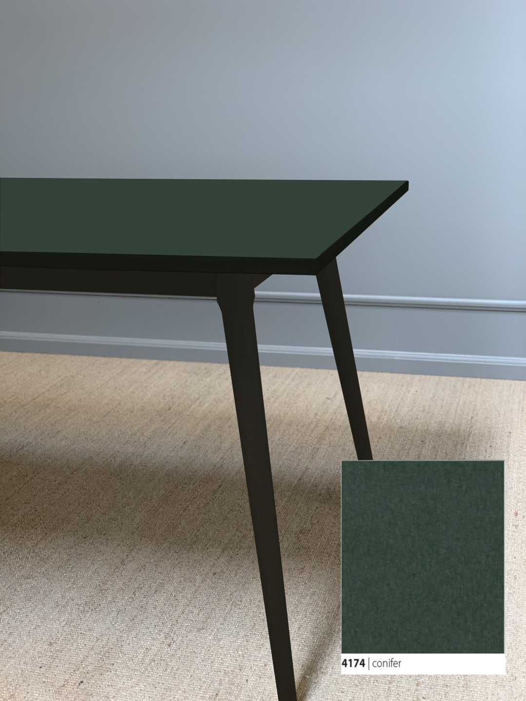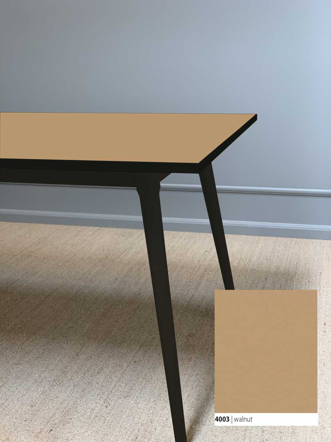 Et smukt og klassisk spisebord med et moderne udtryk, der tager afsæt i kombinationen af den bløde linoleumsbordplade, som både er funktionel og vedligeholdelsesvenlig, og et håndlavet smukt stel til at bære bordet.