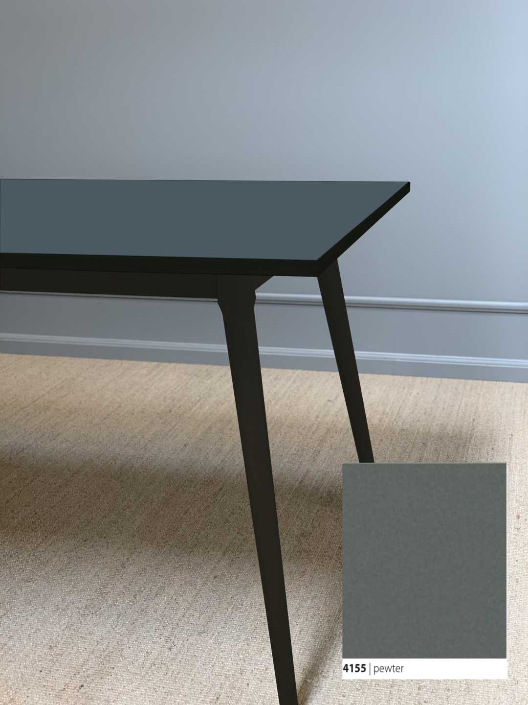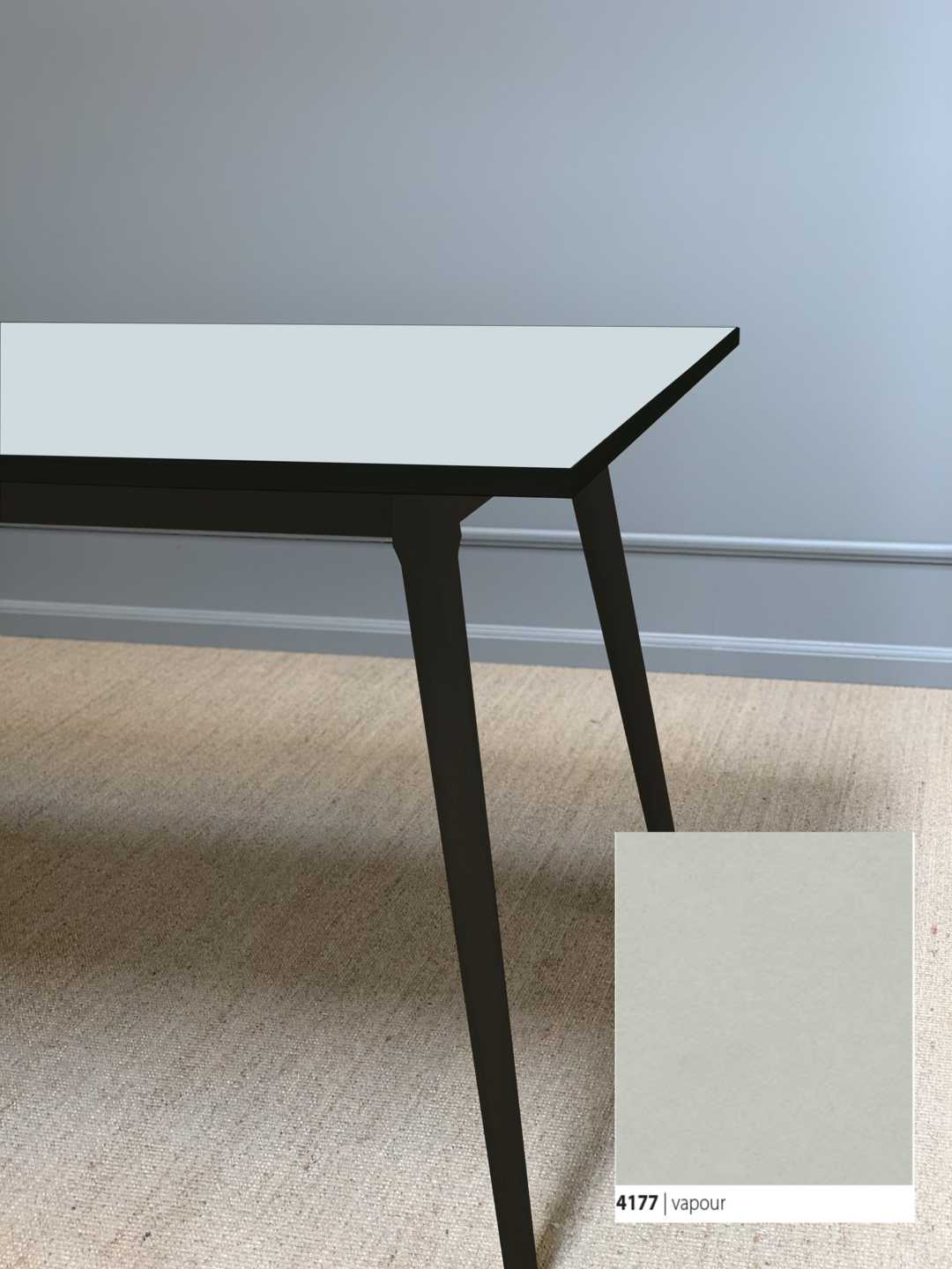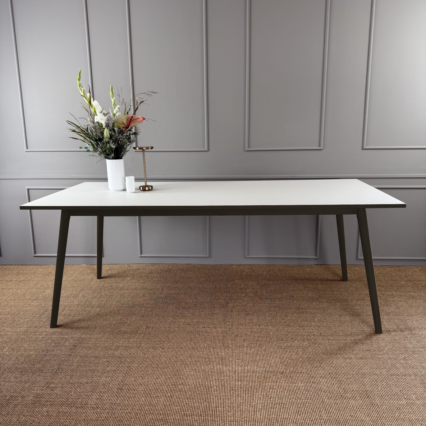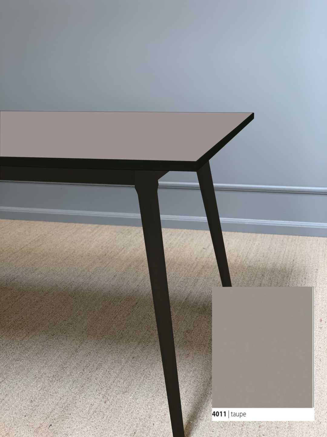 Et smukt og klassisk spisebord med et moderne udtryk, der tager afsæt i kombinationen af den bløde linoleumsbordplade, som både er funktionel og vedligeholdelsesvenlig, og et håndlavet smukt stel til at bære bordet.