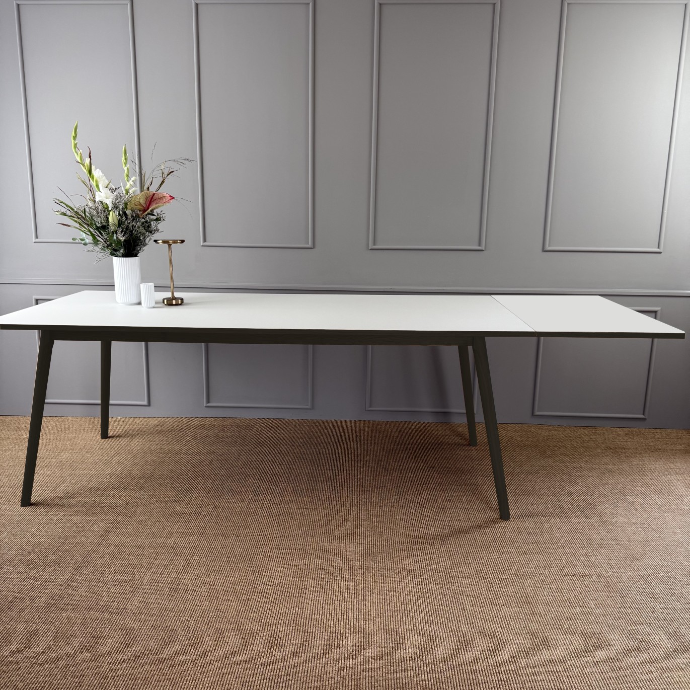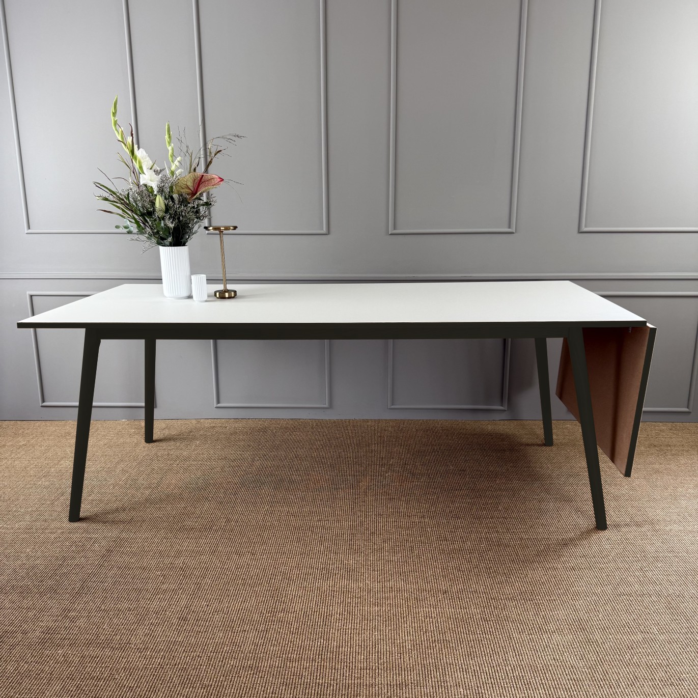 Lækkert kvalitetsbord – med eller uden tillægsplader, skal tilvælges fra start hvis dette ønskes. Tillægspladerne som måler 50 cm kan hænge på hele tiden eller tages af og de små beslag kan drejes ind under bordet så de ikke er synlige når de ikke anvendes.